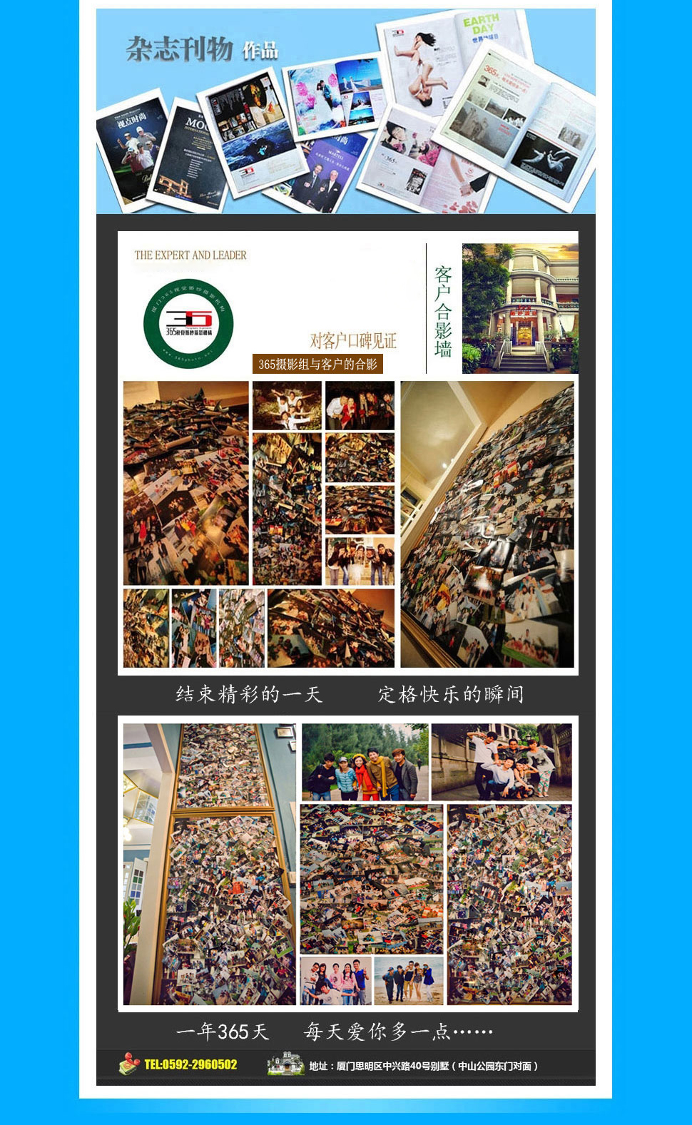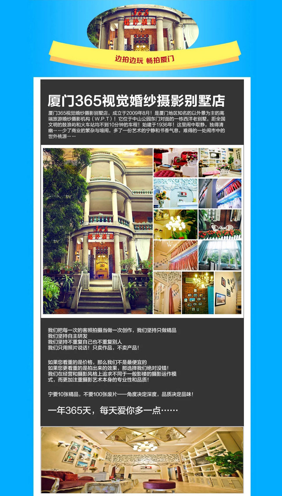廈門365視覺(jué)婚紗攝影別墅店,成立于2009年8月!是廈門地區(qū)知名的以外景為主的高端旅游婚紗攝影機(jī)構(gòu)(W.P.T)!365攝影以廈門地區(qū)為核心,努力打造全國(guó)知名的優(yōu)秀旅拍婚紗攝影品牌!