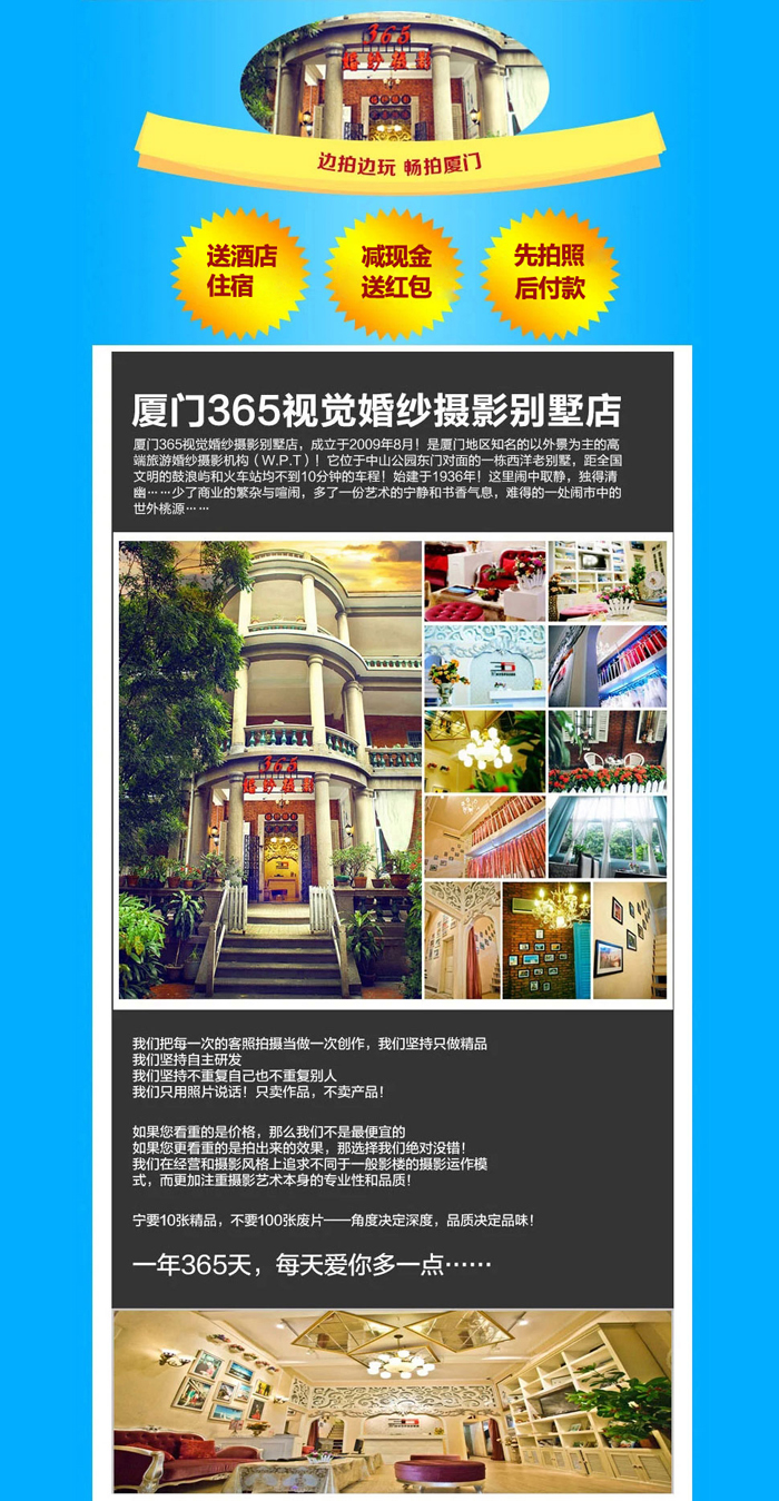 讓每一位顧客通過365視覺的攝影與服務(wù),不僅獲得理想的婚紗照,而且,讓您真正體會到廈門婚紗攝影哪家好!,專業(yè)是我們始終的服務(wù)承諾。